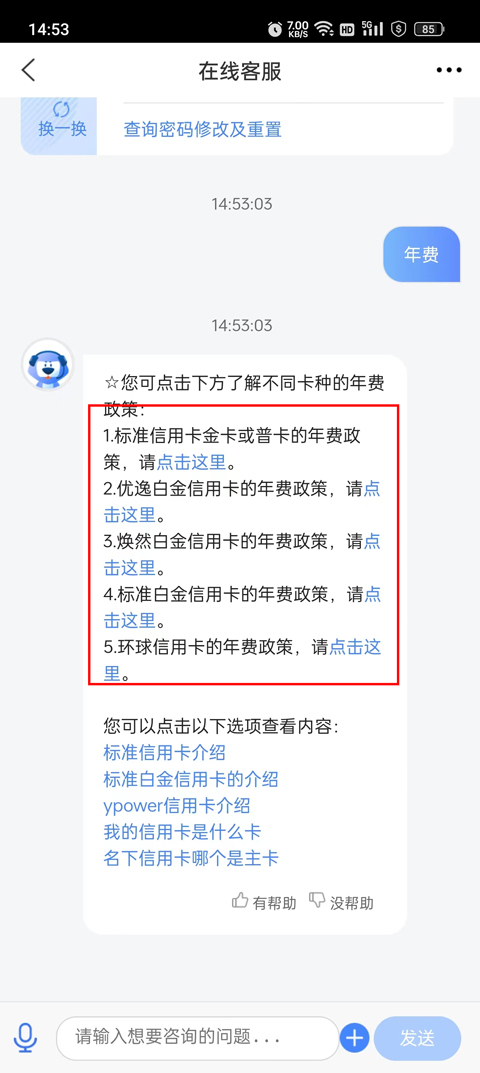 4、在输入框输入年费,然后发送就会回复各种年费详情,想查询哪一种就点击哪一种即可。