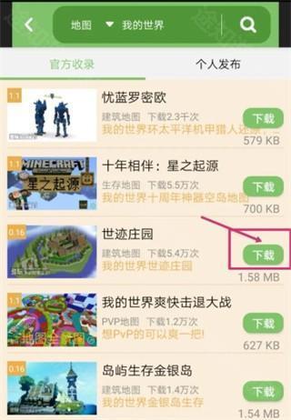 4、在搜索结果中找到心仪的地图,点击下载按钮,完成后即可一键安装至《我的世界》手机版中,即刻开启全新冒险。