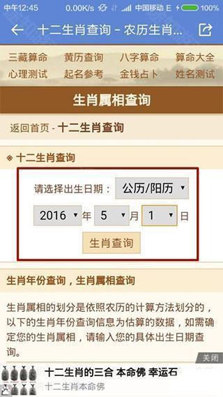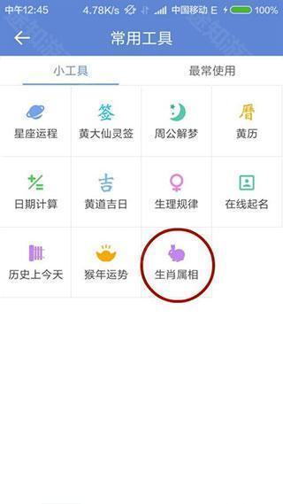 在常用工具列表中,选择“生肖属相”,即可进入属相查询界面。