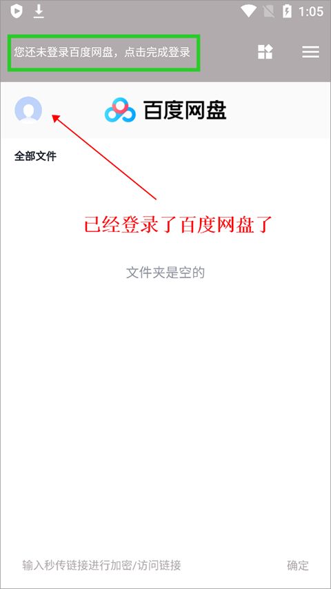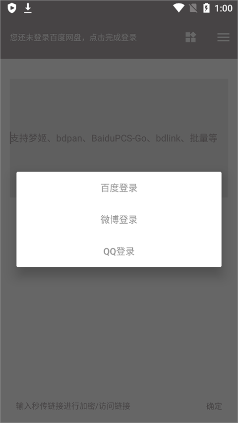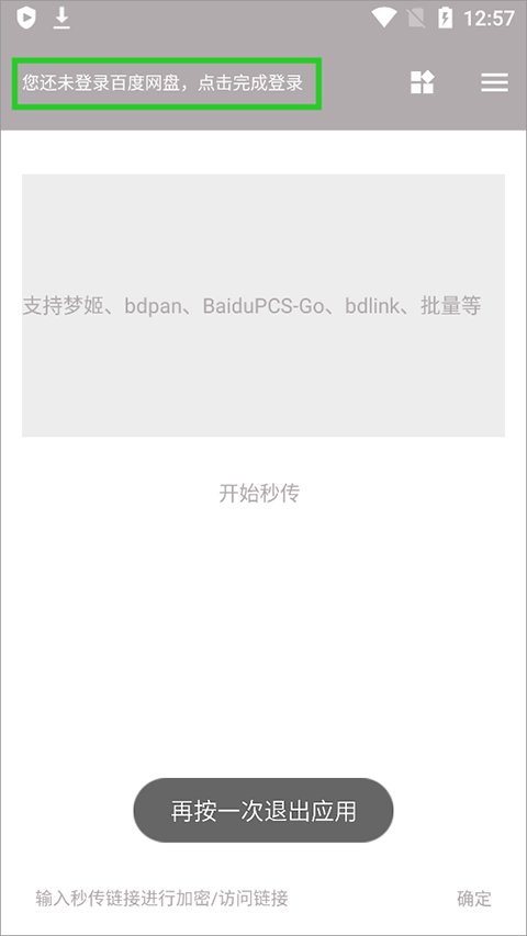 用户首次使用狐悠秒链app时,需先确保已登录百度网盘App。打开狐悠秒链app后,若未检测到百度网盘登录状态,软件会提示用户尚未登录。