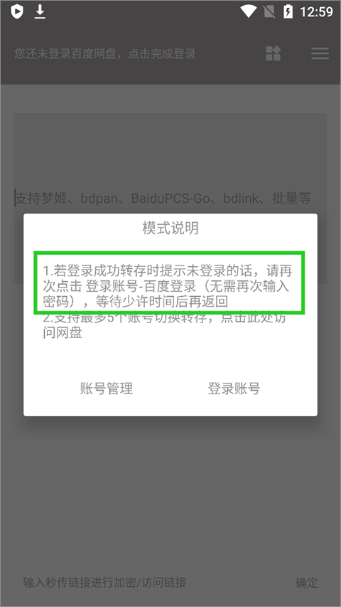 即使已登录百度网盘,若仍出现上述提示,可点击提示框中的“登录账号”进行二次确认,此时无需重新输入密码。