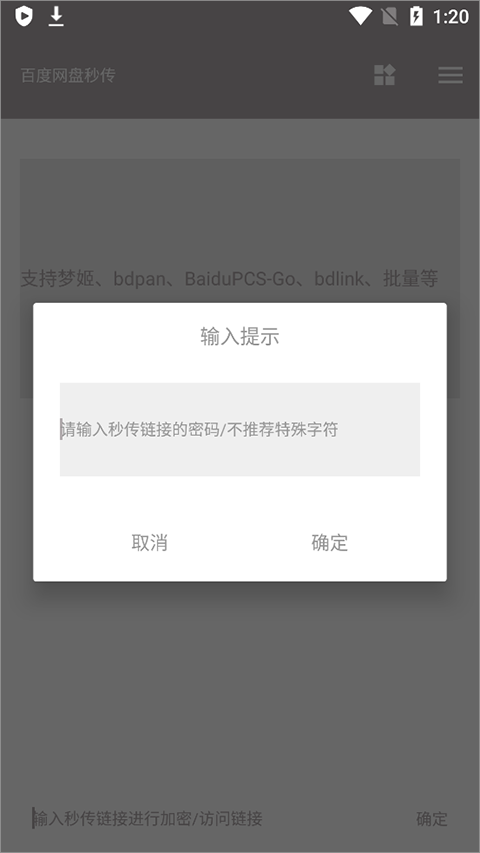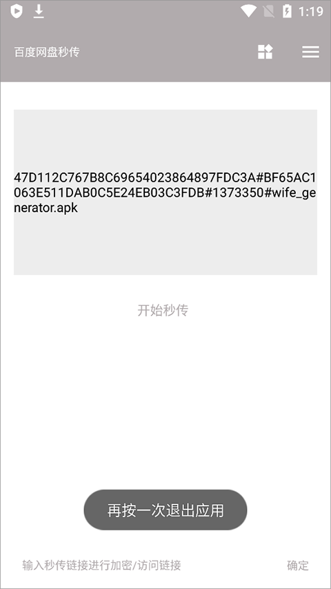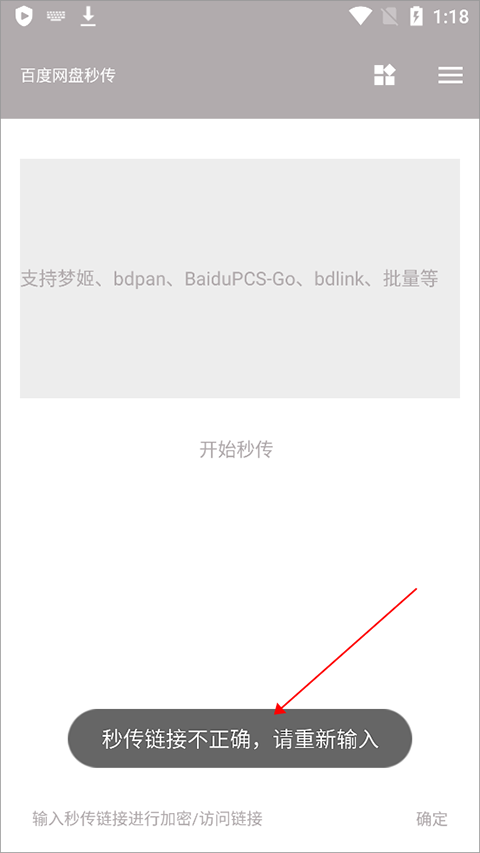 成功登录后,点击页面底部输入框,即可输入符合规范的秒传链接进行加密或访问。注意链接格式必须准确,否则将提示错误。