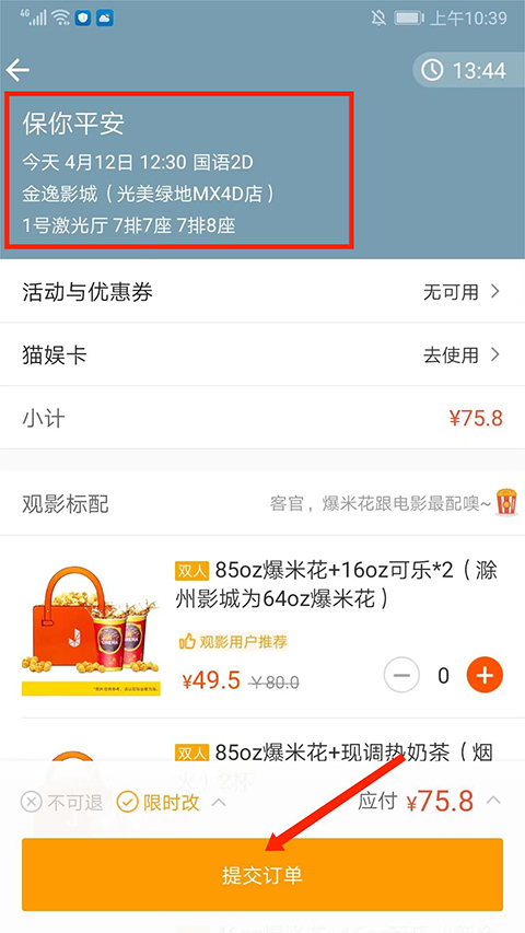 7、进入【订单】界面,确认好影片信息后,最后选择下方【提交订单】进行支付即可订购电影票了。