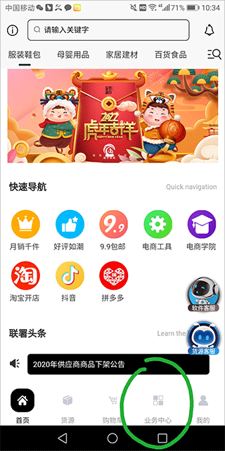 1、打开并登录app,点击底部导航栏中的“业务中心”进入操作界面。