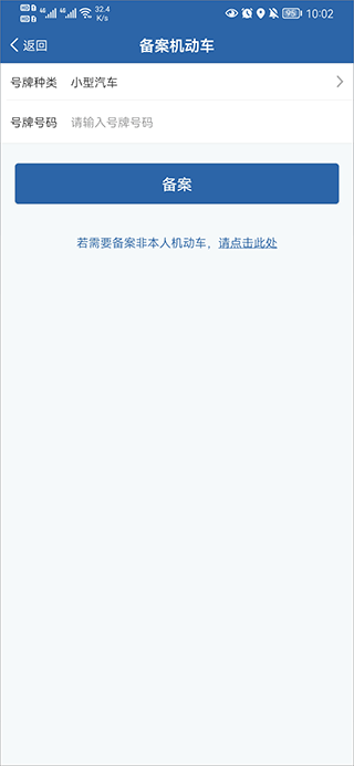 2、输入车牌号码后点击【备案】即可完成本人机动车备案;如需备案非本人车辆,点击相应选项继续操作。