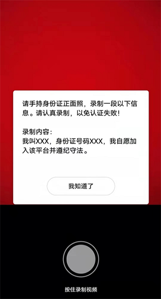 4、进行【视频认证】时,需手持身份证正面,录制一段视频,内容为:“我叫XXX,身份证号码XXX,我自愿加入该平台并遵纪守法。”