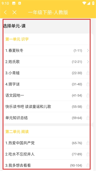 进入教材单元页面后,系统会列出所有课程单元,例如【1.春夏秋冬】,点击具体课程即可开始对应内容的学习。