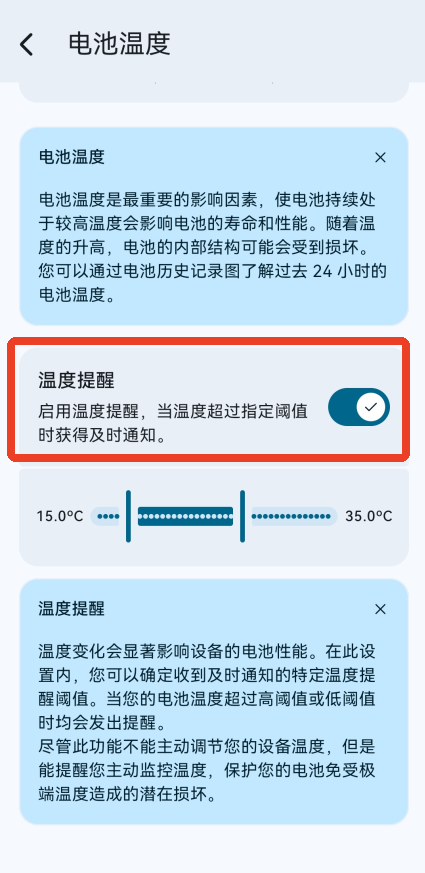 5、点击电池温度下滑,可以开启充电保护,可以防止温度过高,延长电池的使用寿命。
