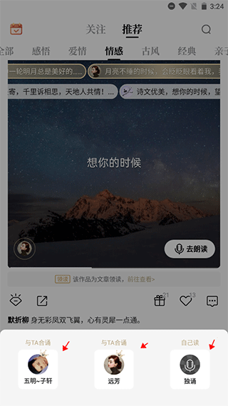 2、在弹出选项中选择【与TA合诵】或【独诵】,这里以“独诵”为例进行操作。