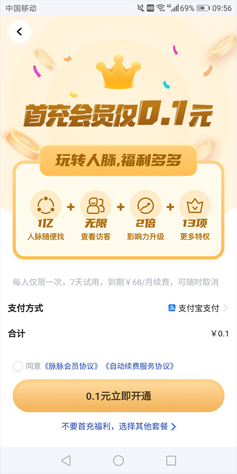 开通自动续费后,您的脉脉账号将与指定的第三方支付账户绑定。平台将在您所购服务到期前24小时内自动扣取下一期费用,并延续相应服务内容、条件及期限。