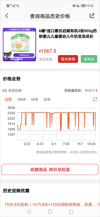 4、页面将完整展示该商品的历史价格变化情况,助你判断当前是否为入手良机。