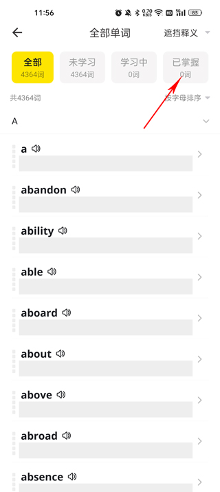 2、在“全部单词”页面切换到“已掌握”栏目,点击“选词重学”,勾选需要重新学习的单词,最后点击“重新学习”即可完成重置。