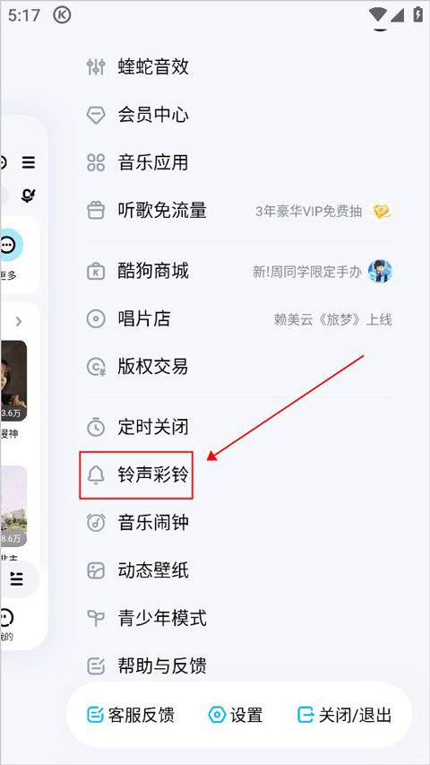 1、打开酷狗音乐,点击右上角下拉菜单,找到并进入“铃声彩铃”功能入口。