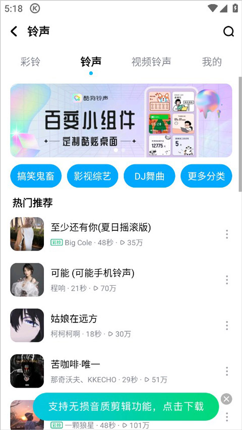 2、在铃声列表中挑选你喜欢的歌曲或彩铃进行预览。