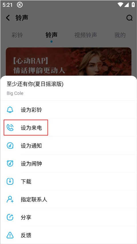 3、点击所选铃声右侧的三个点图标,在弹出菜单中选择“设为来电”,即可完成设置。