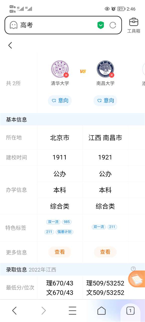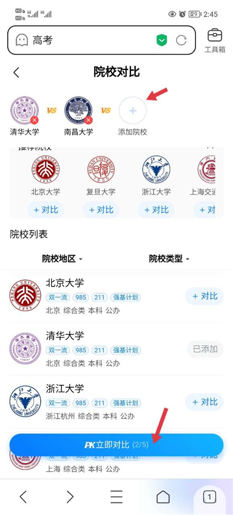 3、添加最多五所目标院校进行横向对比,确认后点击“立即对比”。
