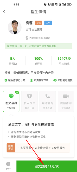 5、进入医生主页后,选择“图文咨询”即可继续追问,深化沟通。