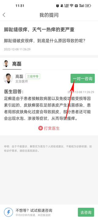 4、在医生回答页面右上角,点击“一对一咨询”;