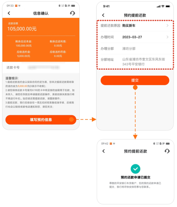 3、填写预约信息,包括前往平安银行分中心的时间、原因等,系统将自动显示对应网点名称与地址。确认无误后点击【提交】,完成预约申请。