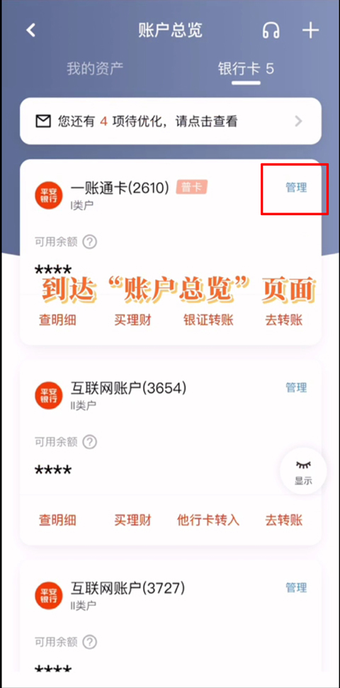 2、在【账户总览】页面中,点击右上角【管理】(见图中红色方框)。