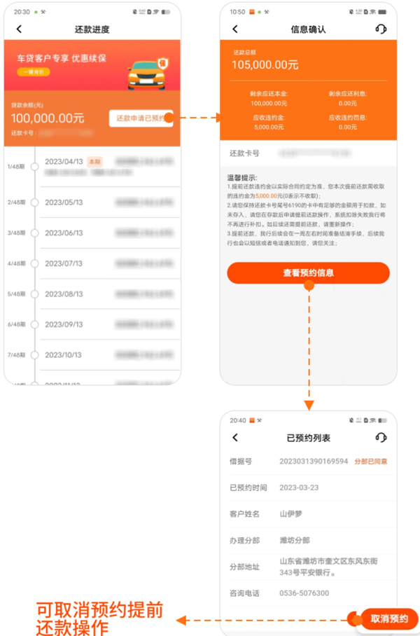 4、用户可随时进入“还款进度”页面查看已预约信息,如行程有变,也可在此取消预约。