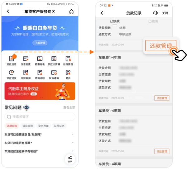 1、用户需提前在平安口袋银行app内预约。进入APP后搜索【车贷专区】,找到【车贷客户服务专区-贷款信息-还款管理】。