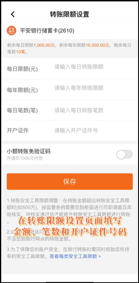 4、在转账限额设置页面,填写新的单笔/日累计金额、笔数及开户证件号码等信息,提交后即可生效。