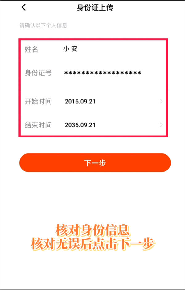 7、上传成功后核对证件信息,点击【下一步】。