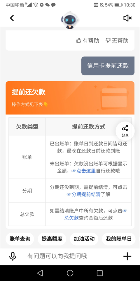 用户可进入APP客服页面,输入“信用卡还款”,选择所需还款类型后,按系统指引完成操作即可。