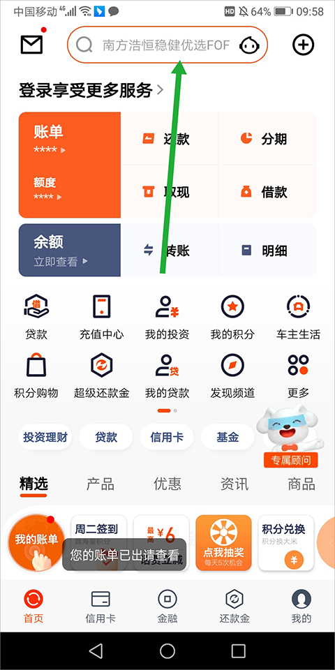 1、打开平安口袋银行APP,点击首页顶部的搜索框。