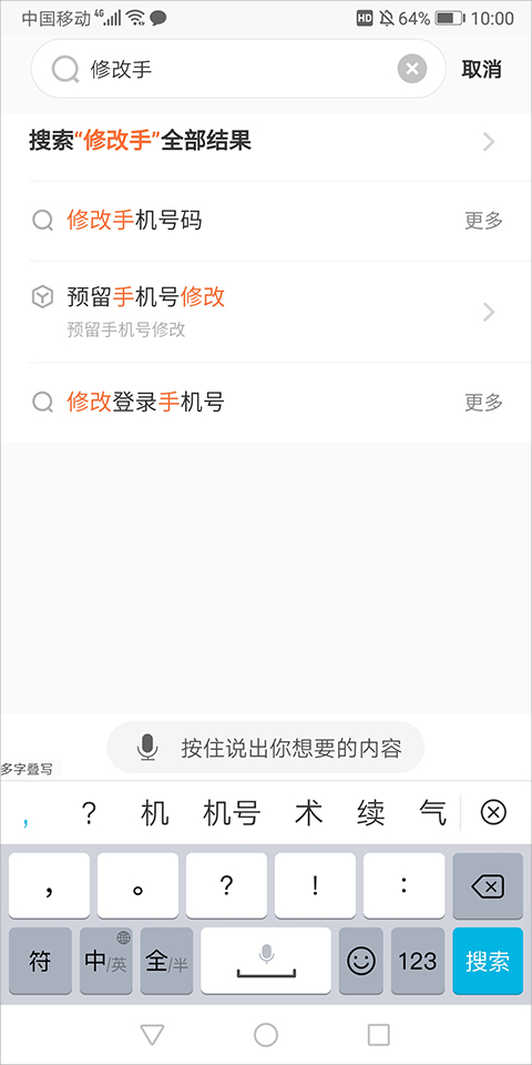 2、在搜索框中输入“修改手机号”。
