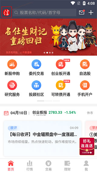 股票入口包括:自选股、委托交易、新股申购和智能投顾股票大师,支持手机自助开户,投资起步更轻松;