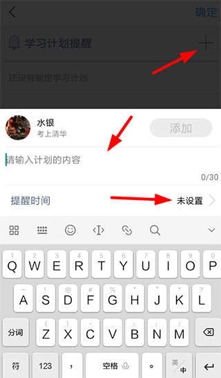 3、点击右上角的“+”按钮,即可创建新的学习计划,并可设置提醒时间,帮助您更好地掌控学习节奏。