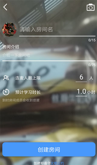 2、根据提示填写“房间名”和“房间介绍”,设置“连麦人数上限”与“预计学习时长”,即可成功创建连麦房间。