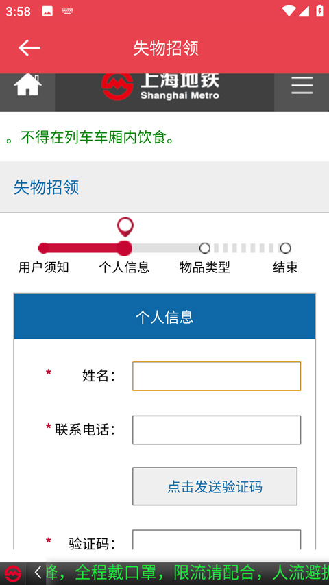 2、点击“物品挂失”,阅读用户须知后,填写个人信息及遗失物品详情并提交