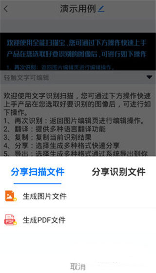 4、点击【分享】按钮,若选择【分享扫描文件】,可导出为图片或PDF;若选择【分享识别文件】,则支持导出为TXT、PDF或Word格式。