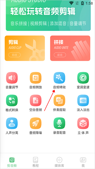 打开应用后,首先根据你的需求选择对应的功能入口,例如点击“剪辑”开始音频编辑。