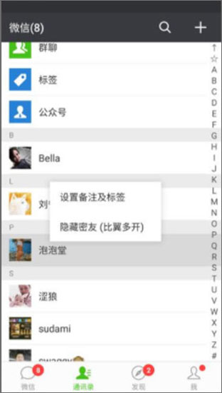 1、打开比翼多开app,然后启动微信,在通讯录中长按该好友;