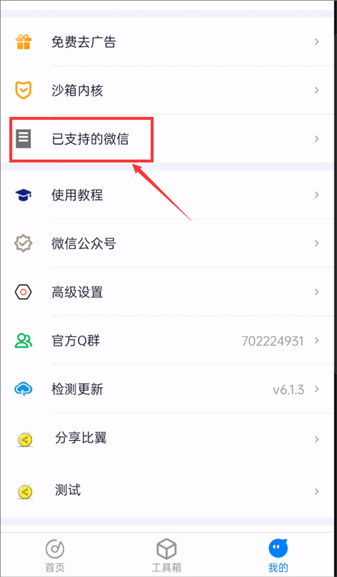 1、打开比翼多开,点击我的,已支持的微信,点击进入,用我们提供的最新版本微信覆盖安装一下。