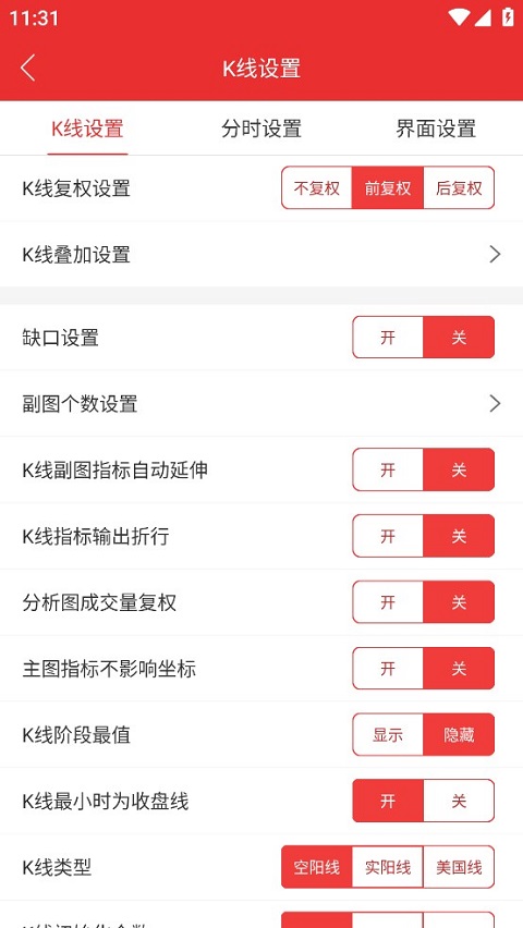 K线设置选项丰富,包括K线叠加、缺口显示、副图指标自动延伸、指标输出折行、阶段最值标记、最小周期收盘线设定、K线类型切换等,满足个性化看盘需求。