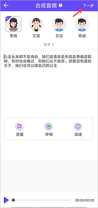 2、接着选择你想要的声音类型,输入音频内容,并在下方对音量、停顿、语速进行调整,接着点击下一步。