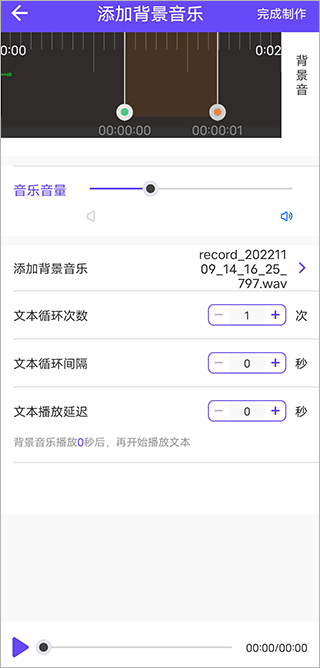 3、进入制作界面后,你可以添加背景音乐、文本循环次数等进行调整,调整好后点击“完成制作后”,即可在列表里导出音频。