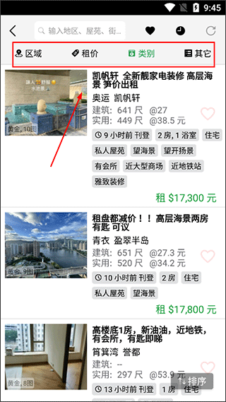 4、进入【住宅】页面后,可根据地区、价格、户型等条件筛选,精准定位理想住房;