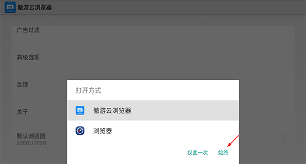 4、选中傲游云浏览器,点击始终即可设置成功。
