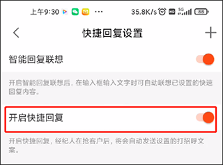 3、开启“快捷回复”功能。