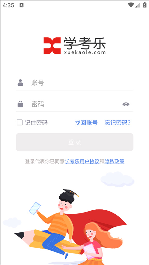 1、打开学考乐app,使用已注册的账号和密码登录;
