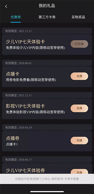 第三步:激活成功后,返回APP进入“我的”-“我的礼品”,即可查看已兑换的体验券。