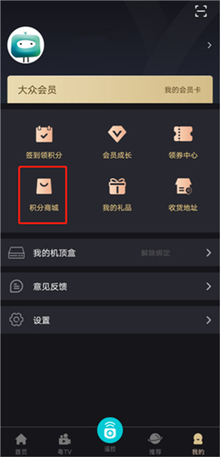 第二步:点击底部导航栏“我的”,进入后选择“积分商城”。