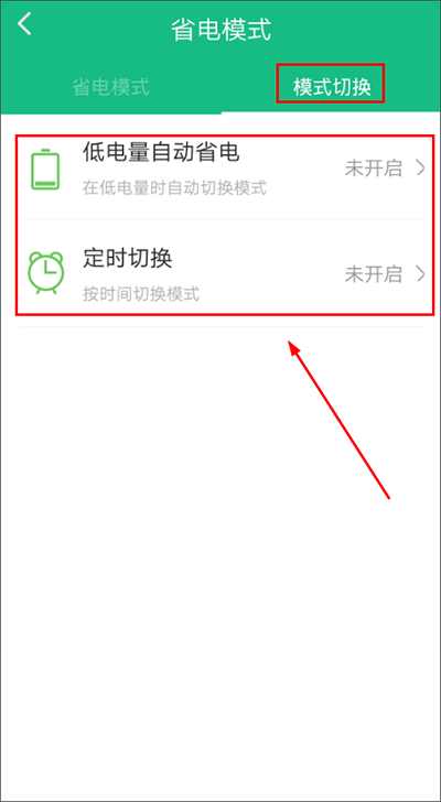 3、点击【模式切换】,这里是自动设置:用户可设定在电量低于某一阈值时自动启用省电模式,或按指定时间段定时开启,实现智能化省电管理,让手机续航更持久。