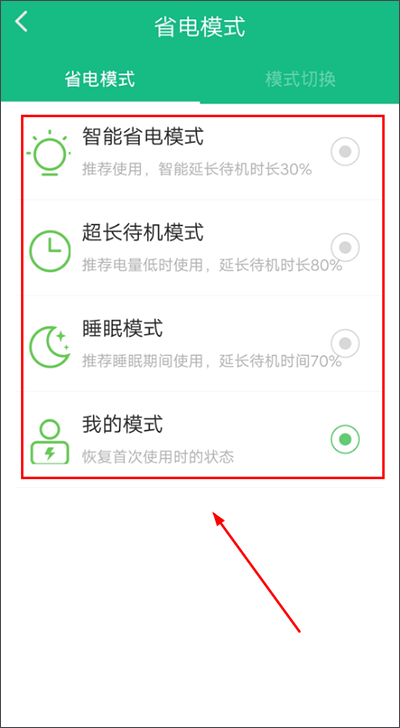 2、在【模式】页面,点击【省电模式】;即为手动设置:用户可根据当前手机电量情况,灵活选择适合的省电策略,快速降低功耗。